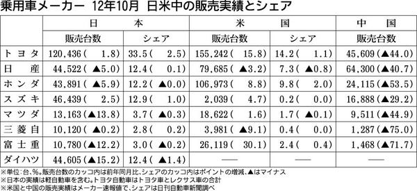 日本の乗用車メーカー8社による2012年10月の日米中での販売台数がまとまった。米国市場全体は前年同月比6・9%の増加だったが、日本メーカーは昨年の震災影響からの立ち直りもあり、トヨタ自動車とホンダ、富士重工業が全需の伸び率を大きく上回る...