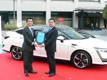 ホンダは、17日からリース販売を開始した新型燃料電池車「クラリティ フューエル セル」の1号車を経済産業省に納車した。ホンダの八郷隆弘社長が星野剛士経済産業大臣政務官にシンボルキーを手渡し、構内を試走した。 納車式で八郷社長は「今後もさら...