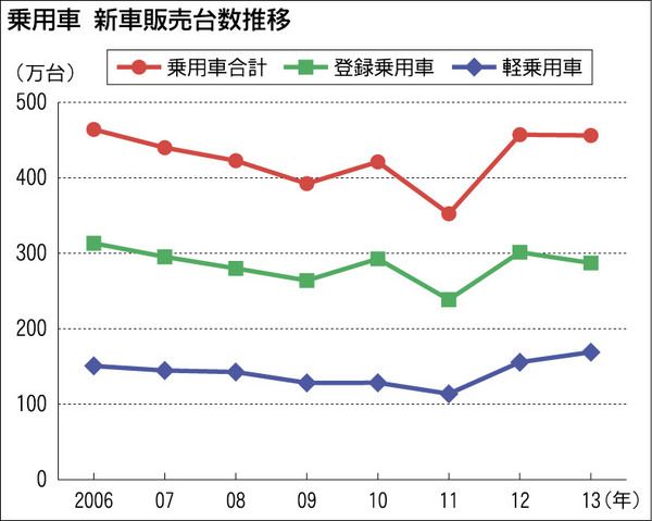 2006年以降の乗用車新車販売(含軽)で車名別販売台数の推移をみると、06年から11年にかけては年販10万台以上のモデルが6~8車種あった。これが12年には11車種、13年には13車種となり2年連続で10車種を超えた。 逆に5万台超(10...