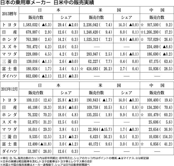 日本の乗用車メーカーによる2013年の日米中販売台数がまとまった。初めて2千万台を超えた中国市場では、トヨタ自動車、日産自動車、ホンダの3社が過去最高の販売台数となった。12月販売では全社プラスとなっており、日中関係悪化前の水準に回復して...