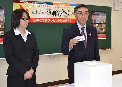 全道オールトヨタ増販キャンペーンの抽選会が札幌トヨタの会議室で15日に行われ、関係者が見守る中、石本康平トヨタ自動車販売店協会北海道支部長が厳正に抽選した。 「オールトヨタ北海道プレミアムキャンペーン」(昨年10月12日~12月23日展開...