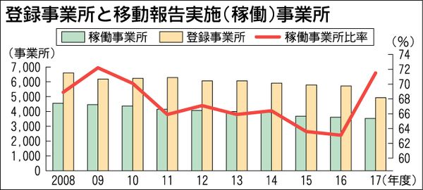 自動車リサイクルで解体工程を担う登録事業所数が、この10年で1千事業所以上も減少していることがわかった。2017年度は前年度比13・7%減の4933事業所となり、08年度と比べると1674事業所減少した。登録事業所のうち当該年度に移動報告...