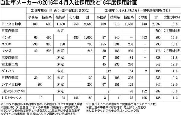 今日、約7500人の新入社員が自動車メーカーに加わる。欧米向けの輸出増などを背景に技能系が増加。数字を公表した10社中7社が前年を上回り、前年度比25・5%増となった。2015年度に増やす傾向が強かった技術系はほぼ前年並みで推移した。17...