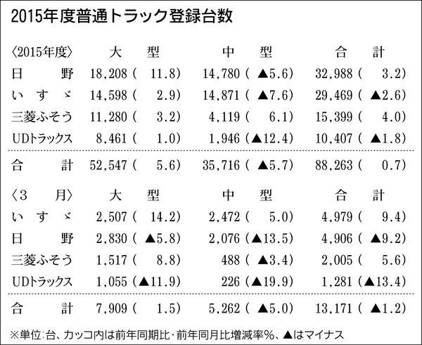 業界筋がまとめた2015年度の普通トラック(積載4トンクラス以上)販売は、前年比0・7%増の8万8236台となった。14年度に続き、2年連続で8万台を超えた。大型車メーカーは「燃料代の低下を受けて、カーゴ系の多い大型が好調に推移した」とし...