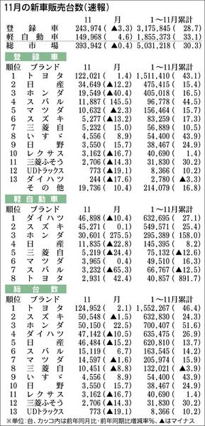 日本自動車販売協会連合会(自販連)、全国軽自動車協会連合会(全軽自協)が3日発表した11月の新車販売台数は前年同月比0・4%減の39万3942台だった。3カ月連続の減少だが、マイナス幅が縮小しエコカー補助金終了後の反動減が収まってきた格好...