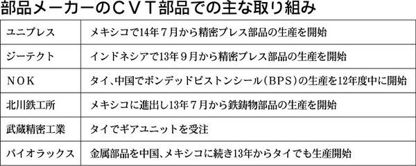 日産自動車による現地調達の推進に伴いCVT(無段変速機)部品の現地化も一段と進む見通しだ。CVTの供給を担うジヤトコの要請に対応し、国内の部品メーカーが日本から送っていた部品の生産を現地化したり、タイやメキシコへの進出や新工場建設を進める...