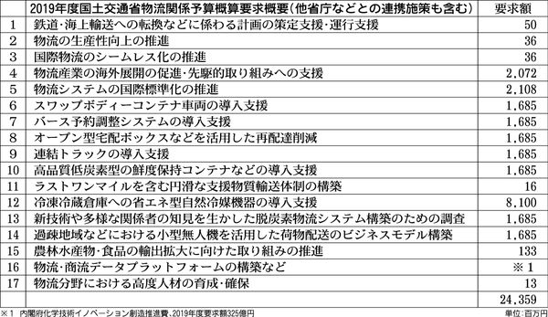 国土交通省が発表した2019年度予算の物流関係概算要求額は、各省庁との取り組みなども含め約244億円となった。戦略的イノベーション創造プログラム(SIP)の「スマート物流サービス」における物流・商流データプラットフォームの構築などを中心に...