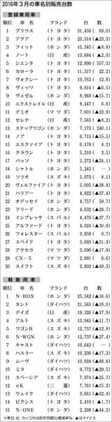 【2016年3月の車名別販売台数】