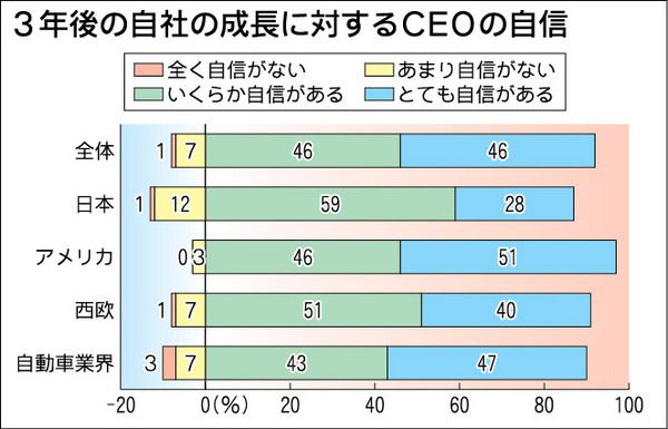 ◆「1年内に世界経済回復」急増の44% プライスウォーターハウスクーパースが実施した「第17回世界CEO意識調査」によると、今後12カ月に世界経済が改善すると回答した最高経営責任者(CEO)は44%と昨年調査の18%から急増した。これは自...