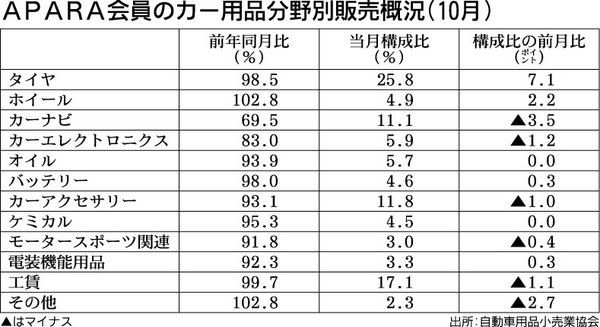 自動車用品小売業協会(APARA、堀江康生会長)は、会員カー用品販売店における10月のカー用品分野別販売概況をまとめた。売上高(7社、1226店)は前年同月比4・6%減の324億180万8千円。2カ月ぶりに減少に転じた。 品目別(工賃、そ...