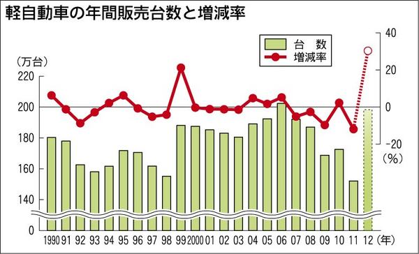 軽自動車の年間販売台数が200万台の大台に届くかどうかのギリギリの水準に達している。2012年1月から11月までの累計販売台数は185万5373台。12月の販売台数が前年と同数(12万7245台)と仮定すると、年間販売台数は198万261...