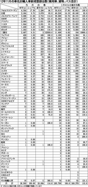 【11月の車名別輸入車新規登録台数(乗用車、貨物、バス合計)】
