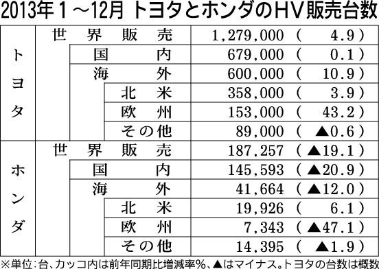 トヨタ自動車とホンダの2013暦年のハイブリッド車(HV)世界販売台数がまとまった。日刊自動車新聞社の調べによると、トヨタは前年比4・9%増の127万9千台。ホンダは新しいHVシステムを搭載した新型車の投入時期の影響で同19・1%減の18...