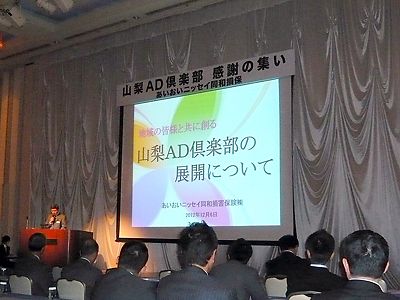 【甲府】あいおいニッセイ同和損害保険山梨支店(上島充弘支店長)は6日、甲府市内のホテルで「山梨AD倶楽部感謝の集い」を開催した。展開する地域貢献活動の取り組みについて報告するとともに記念講演会を実施するなど会場には各業界から約90人が集い...