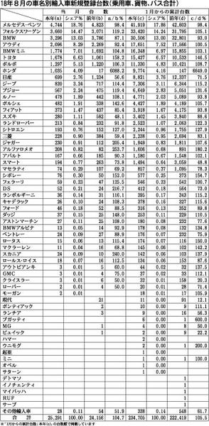【18年8月の車名別輸入車新規登録台数(乗用車、貨物、バス合計)】