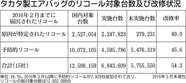 国土交通省は13日、タカタ製エアバッグのリコール(回収・無償修理)進捗状況を公表した。3月末時点の延べ1259万9159台のうち、改修を済ませたのは684万3609台。対象台数が増えたため、改修率は前月末から0・4ポイント下がって54・3...