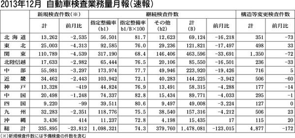 国土交通省は、2013年12月の自動車検査業務量(速報)をまとめた。それによると、新規検査件数は前年同月比4万2466件増の33万5895件、継続検査件数は同8万1794件減の147万8081件。構造等変更検査件数は同172件減の4877...