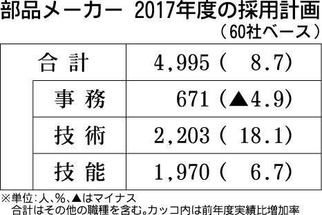 部品メーカーが技術職の新卒採用に対する意欲を例年以上に高めている。日刊自動車新聞社の採用調査によると、大卒理工系・高専卒の採用計画は前年度実績比18・1%増となった。自動運転などの先進運転支援システム(ADAS)の高度化に向けた研究開発が...
