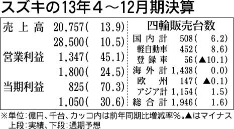 スズキは6日、2014年3月期連結業績見通しを上方修正すると発表した。前回公表(13年11月1日)値に比べ、営業利益を100億円増の1800億円、経常利益を100億円増の1900億円、純利益を50億円増の1050億円とし、営業・経常利益が...