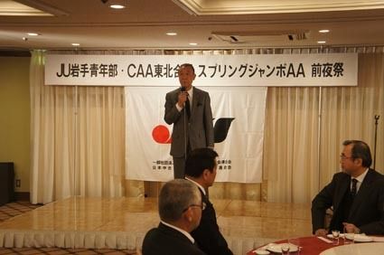 【盛岡】JU岩手は11日、盛岡市内で「JU岩手青年部合同スプリングジャンボ・CAA東北開設9周年記念AA」前夜祭を開催した。北海道から関東までのJU関係者が出席し、懇親を深めた。 高橋理事長とCAA永谷社長の挨拶に続き、JU札幌問谷功三理...