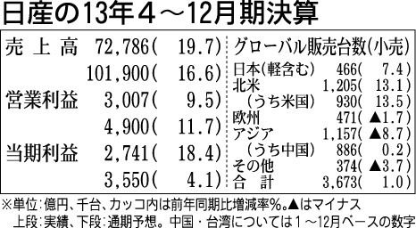 日産自動車は10日、2013年4~12月期の連結業績(東証届出値)を発表した。グローバル販売台数が前年同期比1・0%増の367万3千台と過去最高になったことや為替差益などにより売上高は前年同期比19・7%増の7兆2786億円、営業利益は同...