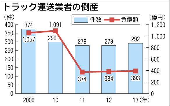 トラック運送事業者の倒産件数が高止まりしている。帝国データバンクによると昨年の倒産件数は292件。アベノミクス効果で倒産全体が減る中で、前年より4・7%増えた。主に中小・零細業者が軽油価格の高騰分を運賃に転嫁できず、赤字体質から抜け出せず...
