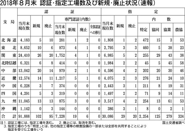 国土交通省は2018年8月末時点の認証・指定工場数および新規・廃止状況をまとめた。認証工場数は前月比7件増の9万1888工場。また指定工場は9件増の3万86工場となり、両者ともにわずかに増加した。専門認証工場数は15件増の7228工場だっ...