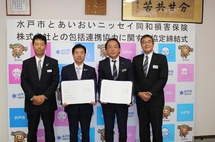 【水戸】あいおいニッセイ同和損害保険茨城支店(新井良裕支店長)はこのほど、水戸市と包括連携協定を締結した。締結式には高橋靖水戸市長と新井支店長、あいおいニッセイ同和損害保険の金田実執行役員、あいおいニッセイ同和インシュアランスサービスの渕...