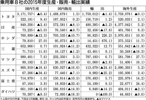 乗用車メーカー8社が26日発表した2015年度の生産・販売・輸出実績によると、8社合計の世界生産台数は2672万2339台となり、前年度に比べ4・5%増加した。トヨタ自動車など4社が前年度を下回ったが、日産自動車、ホンダなど4社が増加した...