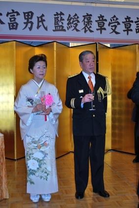 松本自販・松本富男氏の藍綬褒章受章祝賀会、消防団活動35年の功績称える