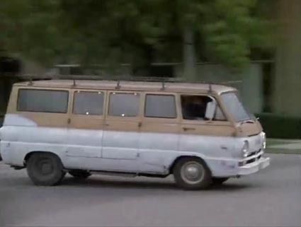 倉庫街を進む青色の小型セダン「トヨタ カローラ」の前に、東洋美術のギャラリーの敷地から4人の泥棒が乗る茶色と白色のツートンカラーの小型バン「ダッジ A―108スポーツマン」が飛び出した。アクション映画「ニンジャII/修羅ノ章」のワンシーン...