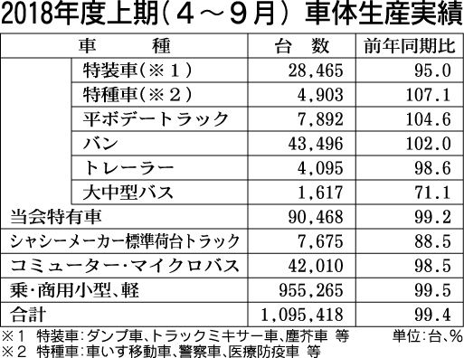 日本自動車車体工業会(綱岡卓二会長)がまとめた2018年度上半期(4~9月)の車体生産実績は、平ボデートラックやバンなど同会特有の車体生産台数が前年同期比0.8%減の9万468台となった。構成台数で2番目に多い特装車の減少が響いた。 会特...
