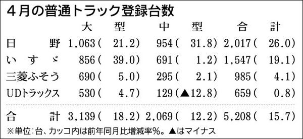 業界筋がまとめた4月の普通トラック(積載量4トン以上)販売は、前年同月比15・7%増の5208台と6カ月ぶりにプラスとなった。大型トラックが18・2%増の3139台で2カ月連続のプラス、中型トラックが12・2%増の2069台で10カ月ぶり...