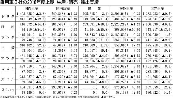 ■国内生産2期ぶり減 乗用車メーカー8社が29日に発表した2018年度上期(4~9月)の生産・販売・輸出実績によると、8社合計の世界生産台数は前年同期比0・9%増の1413万3814台となり、上期として7年連続で前年同期を上回った。ホンダ...
