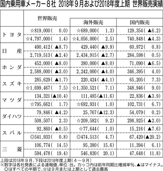 乗用車メーカー8社は29日、2018年度上期(4~9月)の世界販売実績(速報値)を発表した。トヨタ自動車、スズキ、マツダが好調な海外販売を背景に上期として過去最高だった。スバルは全ての半期を通じて過去最高を記録した。日産自動車とホンダは国...
