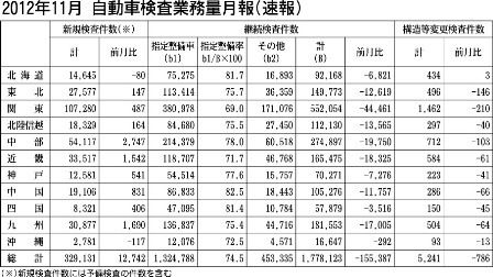 国土交通省は2012年11月の自動車検査業務量(速報)をまとめた。それによると新規検査件数は前月比1万2742件増の32万9131件、継続検査件数は同15万5387件減の177万8123件。指定整備率は同0・7ポイント減の74・5%、構造...