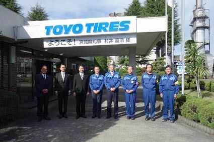 ○…宮城県の村井嘉浩知事は26日、岩沼市の東洋ゴム工業仙台工場を訪問した。東洋ゴム工業の井村洋次執行役員をはじめ同社関係者らが訪問を迎え入れた。2011年から始まった「みやぎの復興現場訪問事業」の一環で、今回は同工場の視察を行った。村井知...