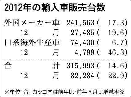 日本自動車輸入組合(JAIA)が10日発表した2012年暦年の輸入車新規登録台数(速報)は、前年比14・6%増の31万5993台だった。30万台超えは1997年以来、15年ぶり。このうち外国メーカー車は同17・3%増の24万1563台で2...
