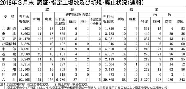 国土交通省は2016年3月末時点の認証・指定工場数と新規・廃止状況をまとめた。認証工場数は前月比5件減の9万2165件で、2カ月ぶりに減少した。指定工場数は31件増の2万9865件となり、10カ月連続で増加している。専門認証工場数は21件...