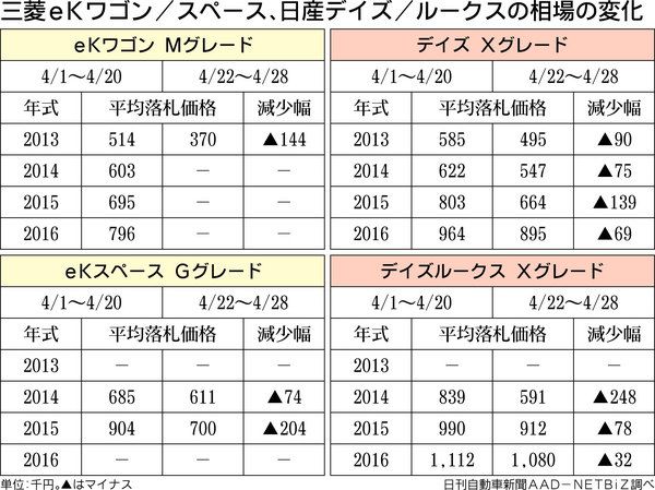三菱自動車が軽自動車4車種の型式認定取得に必要な燃費データで不正を行っていた問題で、中古車オークション(AA)の相場価格にも影響が出始めたことが分かった。2013年式の三菱「eKワゴン」Mグレードの平均落札価格は、4月1日から20日までの...