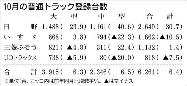 業界筋がまとめた10月の普通トラック(積載量4トン以上)新車販売台数は、前年同月比6・4%増の6261台と、2カ月連続で増加した。昨年は排出ガス規制後で販売が低迷したが、その反動でプラスを維持した。 大型トラックは6・3%増の3915台、...