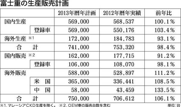 富士重工業が15日、東京都中央区のベルサール八重洲で開いた2013年新春記者会見における主な質疑応答は次のとおり。 ―米国をはじめ、世界販売は野心的な目標に映るが 吉永泰之社長「野心的と言われればそうかなと思う。ただ、我々は現在も米国など...