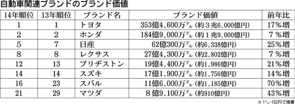 自動車関連ブランドが大躍進―。コンサルティング会社のインターブランドジャパン(和田千弘社長、東京都千代田区)がこのほど発表した日本企業のブランド価値を金額化し順位付けする「Japan’s Best Global Brands 2014」で...