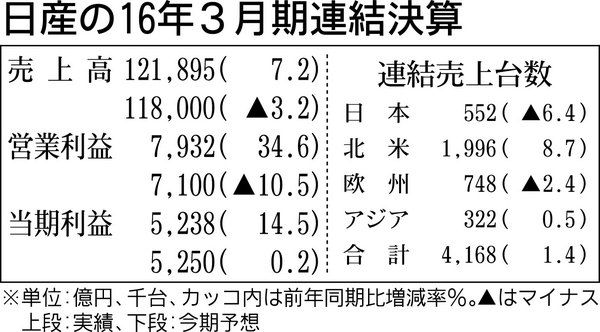 日産自動車が12日発表した2016年3月期決算(日本基準)は、売上高と当期純利益が前期を上回り、売上高は過去最高だった。営業利益は2期連続で増加した。北米や中国で販売が増加し、世界販売台数が過去最高を更新した。17年3月期は販売台数の増加...