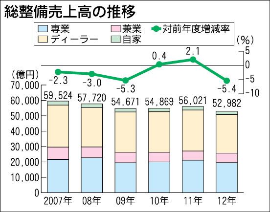 日本自動車整備振興会連合会(日整連)は17日、2012年度「自動車分解整備業実態調査」の結果を発表した。そ総整備売上高は3年ぶりに減少に転じ、前年度比5・4%減の5兆2982億円にとどまった。東日本大震災後の整備需要の冷え込みで車検以外の...