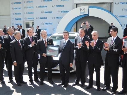 ■量産1号車に大統領がサイン マツダのメキシコ量産第1号車に大統領が記念のサイン―。27日、マツダデメヒコビークルオペレーション(MMVO)の開所式に出席したエンリケ・ペーニャ・ニエト大統領は式典終了後、MMVOの一部を視察し「ジョグワン...