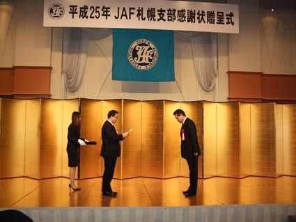 日本自動車連盟(JAF)札幌支部(原田彦エ門支部長)は27日、「平成25年感謝の会」を市内のホテルで開催。昨年の入会促進で実績が優秀だった自動車販売店、入会取扱店、指定工場と個人に感謝状を贈呈した。 受賞各社の代表者と社員、来賓など約20...