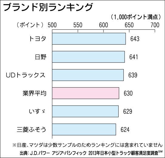 ◆4年連続トヨタ首位、2位は日野 J・D・パワーアジアパシフィック(鈴木郁社長、東京都港区)がまとめた2013年の日本小型トラック顧客満足(CS)度調査によるとトヨタ自動車が4年連続で首位を獲得した。2位は日野自動車となった。日野は先に公...
