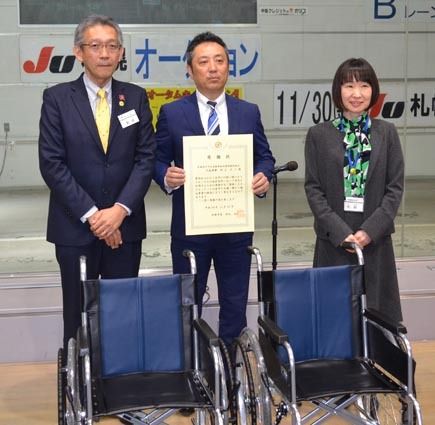 札幌中古自動車販売協会・札幌地方中古自動車販売事業協同組合(JU札幌、問谷功三会長・理事長)は16日、札幌市西区保険福祉部福祉課に車椅子2台を寄付した。同日、競りに先立ち寄贈式を開いた。JU札幌の指導環境委員長を務める桑原望副会長が粟崎寿...