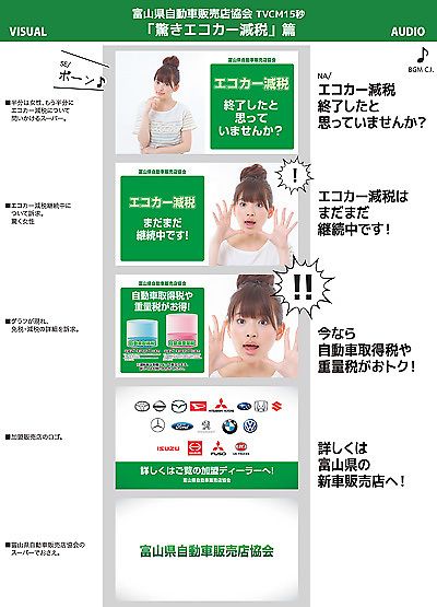 富山県自動車販売店協会(黒澤敏会長)は、エコカー減税をPRするために21日から30日までテレビCMを放映している。 エコカー補助金の終了によりエコカー減税も終了したと誤解しているユーザーも多いことから、CMを通じて減税の継続を訴求し新車販...